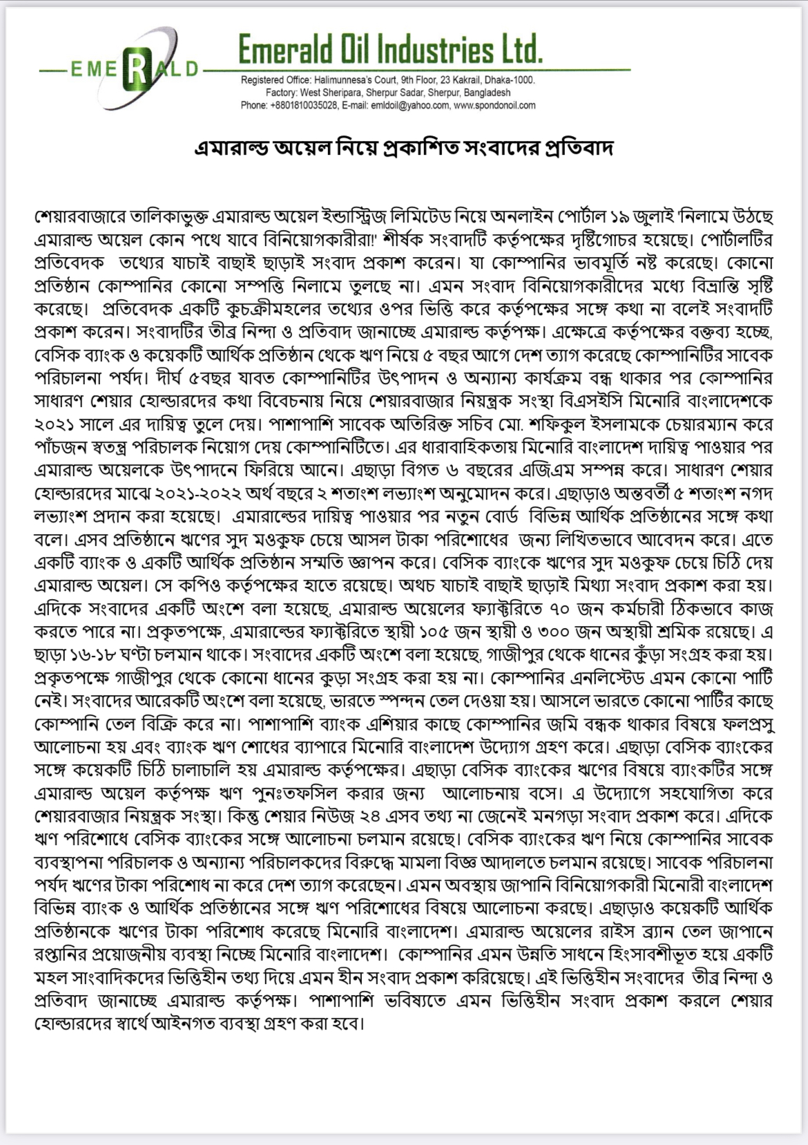 এমারেল্ড অয়েল নিয়ে প্রকাশিত সংবাদের প্রতিবাদ