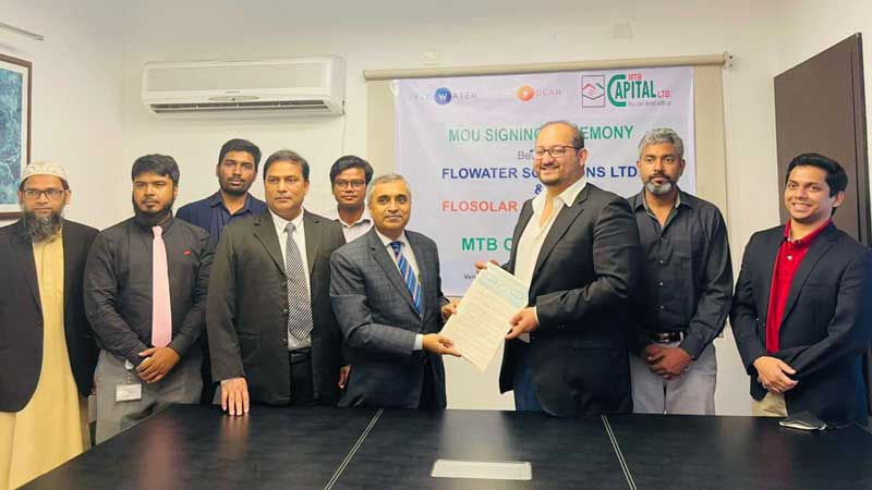 পুঁজিবাজারে আসতে মার্চেন্ট ব্যাংক এমটিবি ক্যাপিটাল লিমিটেডের সঙ্গে সমঝোতা স্মারক (এমওইউ) সই করেছে ফ্লোওয়াটার সলিউশনস লিমিটেড ও ফ্লোসোলার সলিউশনস লিমিটেড। সম্প্রতি আয়োজিত এ সম্পর্কিত এক অনুষ্ঠানে এমটিবি ক্যাপিটালের সিইও খায়রুল বাশার আবু তাহের মোহাম্মদ এবং ফ্লোওয়াটার ও ফ্লোসোলারের প্রতিষ্ঠাতা ও ব্যবস্থাপনা পরিচালক মোস্তফা একে খান এ এমওইউতে সই করেন।