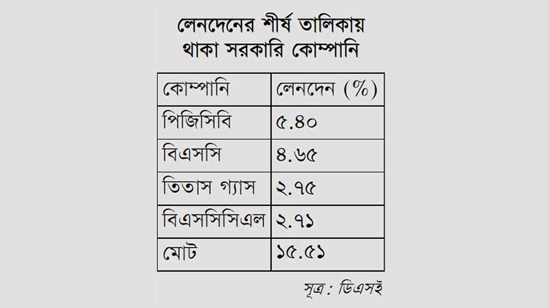 দেশের প্রধান পুঁজিবাজার ঢাকা স্টক এক্সচেঞ্জে (ডিএসই) গত সপ্তাহে লেনদেনে সরকারি কোম্পানিগুলোর আধিপত্য দেখা গেছে। এমনকি এক্সচেঞ্জটিতে লেনদেনের ভিত্তিতে শীর্ষ ১০ কোম্পানির চারটিই ছিল সরকারি প্রতিষ্ঠান। কোম্পানি চারটি হলো পাওয়ার গ্রিড কোম্পানি অব বাংলাদেশ (পিজিসিবি) লিমিটেড. বাংলাদেশ শিপিং করপোরেশন (বিএসসি), তিতাস গ্যাস ট্রান্সমিশন অ্যান্ড ডিস্ট্রিবিউশন কোম্পানি লিমিটেড ও বাংলাদেশ সাবমেরিন কেবল কোম্পানি লিমিটেড (বিএসসিসিএল)। গত সপ্তাহে ডিএসইর মোট লেনদেনের ১৫ দশমিক ৫১ শতাংশই ছিল এ চার কোম্পানির দখলে।